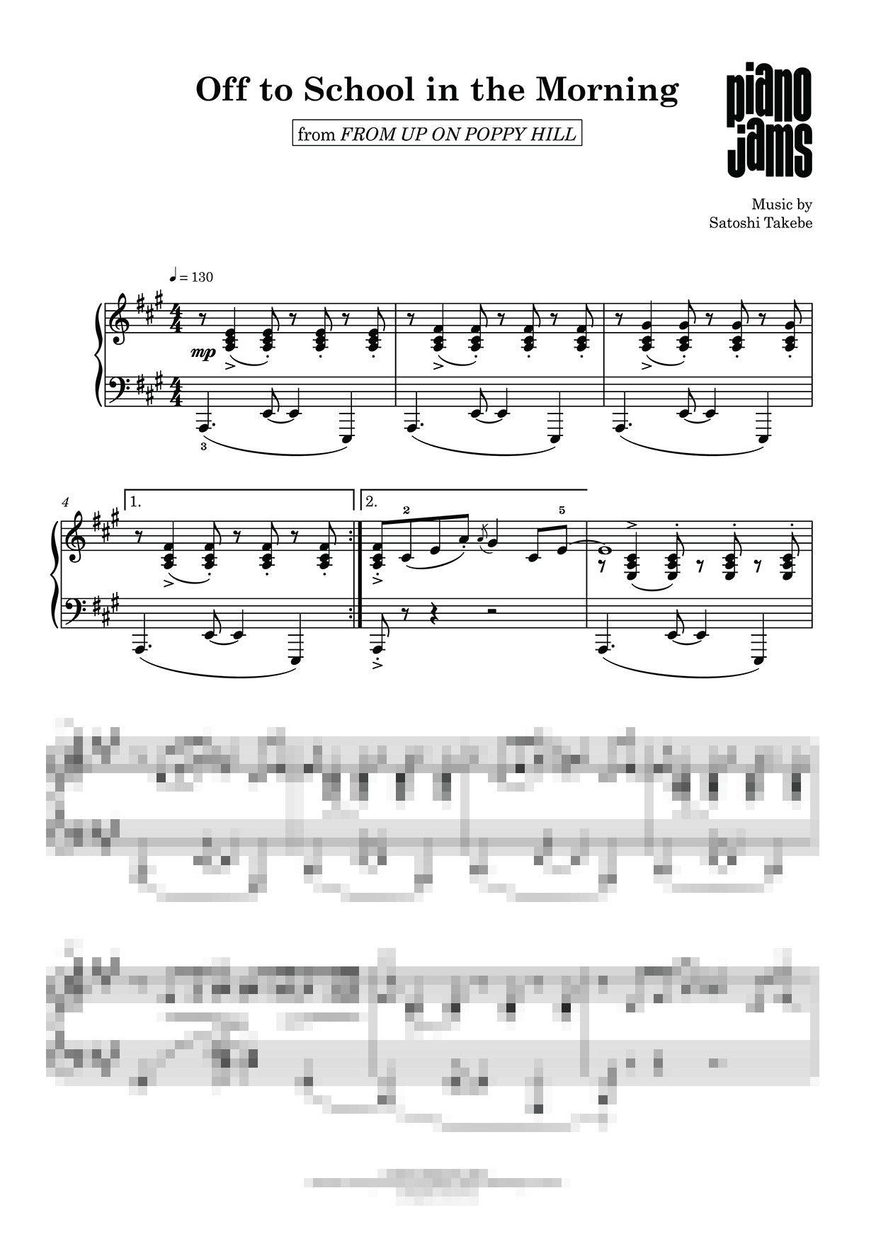 Embark on a musical journey with "Off to School in the Morning," a delightful and playful tune from From Up on Poppy Hill. Composed by Satoshi Takebe, this piece is ideal for intermediate pianists seeking a cheerful addition to their collection.