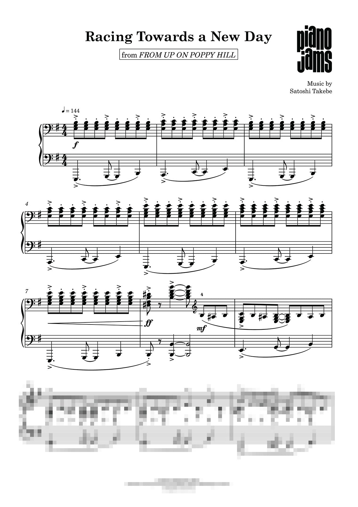 Experience the captivating composition of "Racing Towards a New Day" from From Up on Poppy Hill. This energetic and uplifting piece by Satoshi Takebe is perfect for those who enjoy dynamic and fast-paced melodies.
