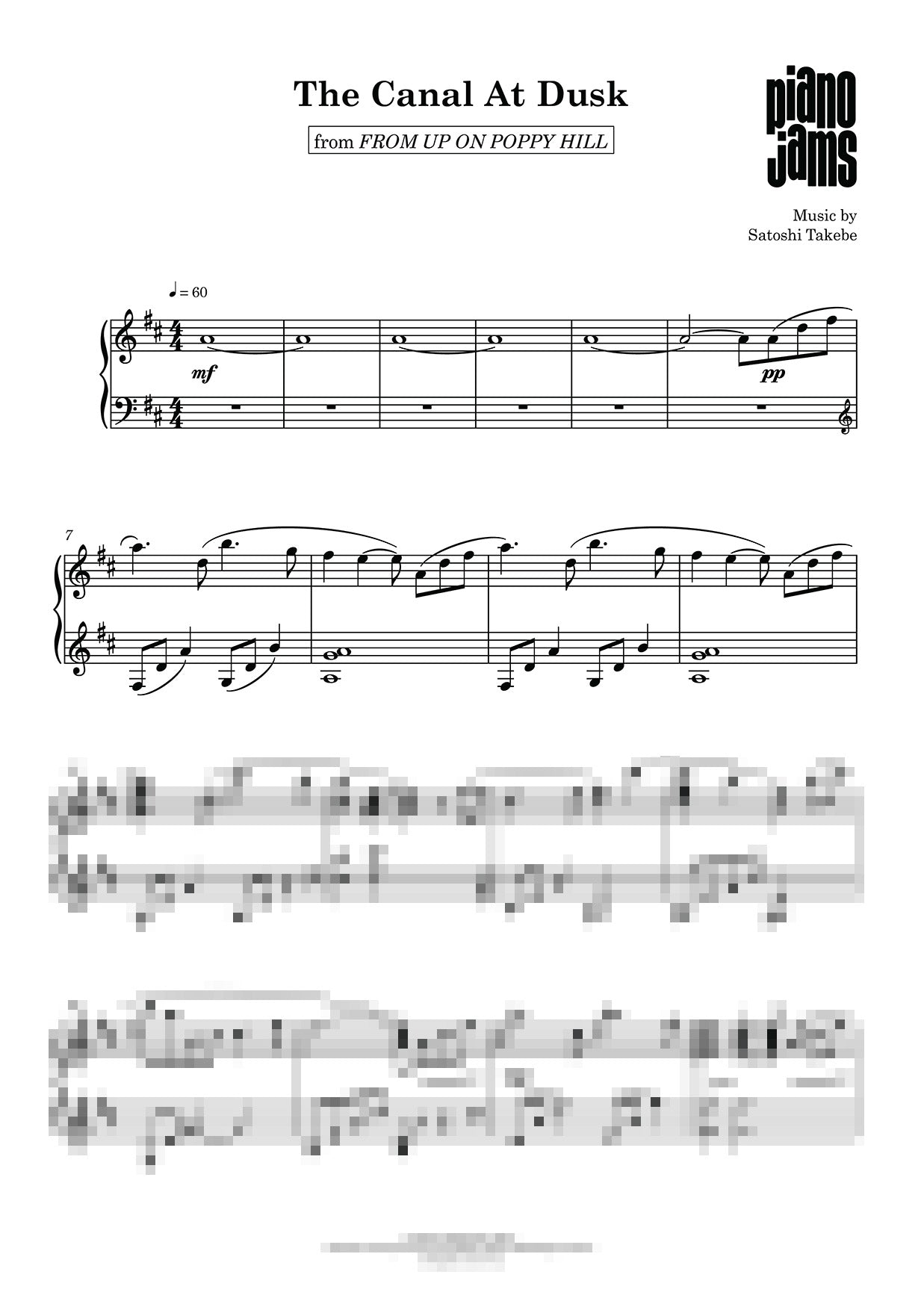 Savor the enchanting melody of "The Canal at Dusk," a beautifully transcribed piano sheet from Studio Ghibli's From Up on Poppy Hill, composed by Satoshi Takebe.