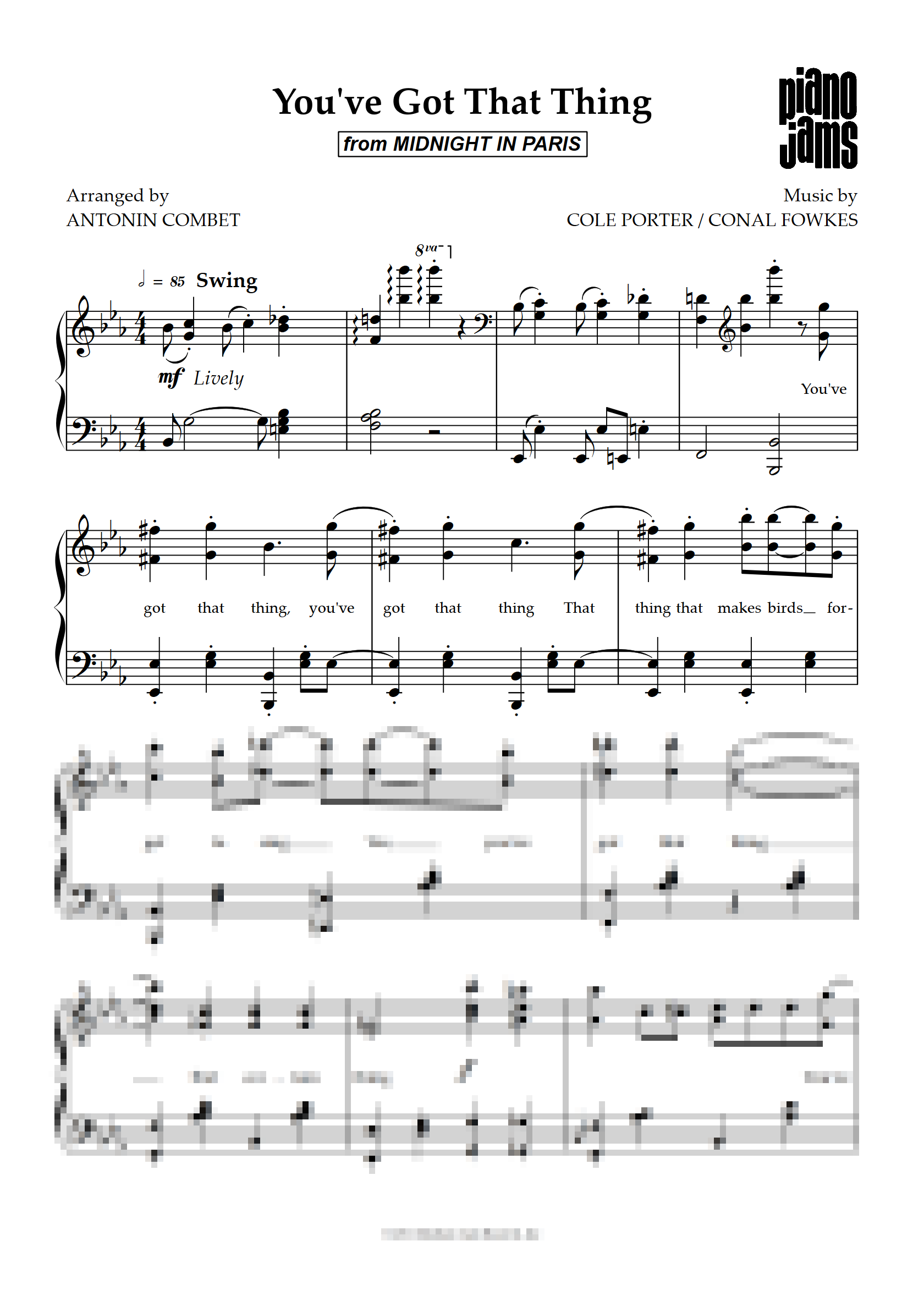 Piano transcription of “You've Got That Thing” by Cole Porter, as featured in Midnight in Paris by Woody Allen. Carefully prepared from the musical material heard in the film, this edition captures the elegance and jazz spirit of the soundtrack for intermediate and advanced pianists.